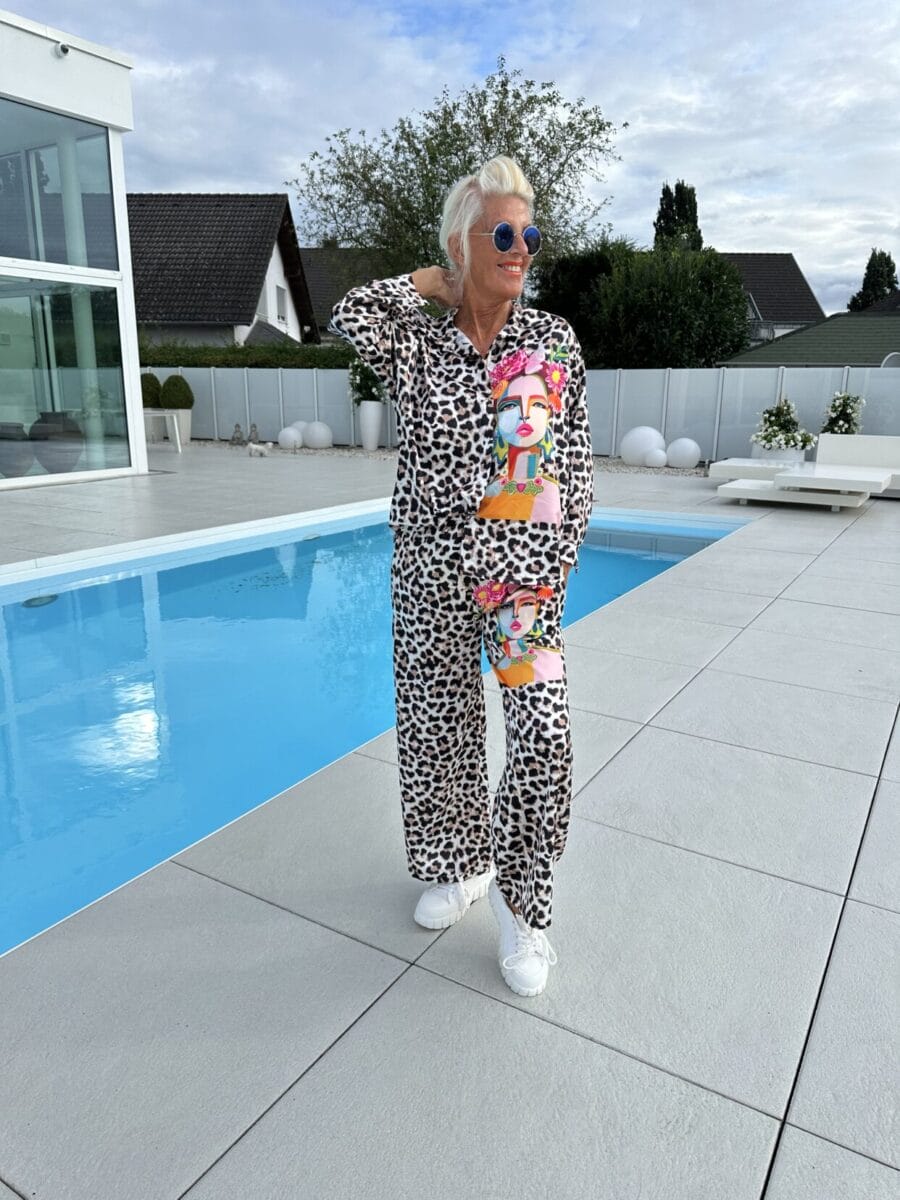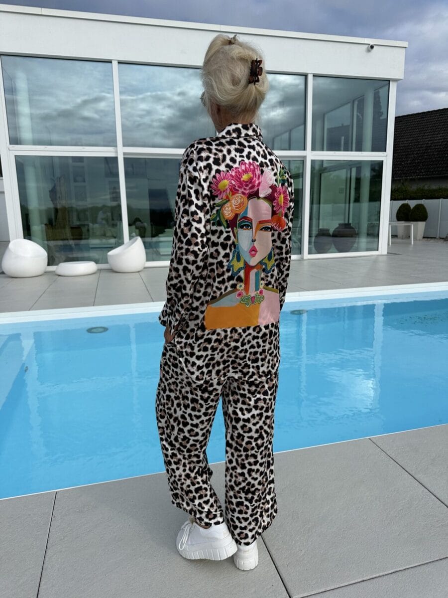 Ten elegancki, dwuczęściowy zestaw z nadrukiem łączy styl i wygodę. Wykonany jest z wysokiej jakości tkanin, aby zapewnić luksusowy wygląd i dopasowanie. Niezależnie od tego, czy jest to formalna, czy nieformalna okazja, ten zestaw doda Twojej garderobie odrobinę wyrafinowania.