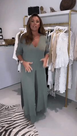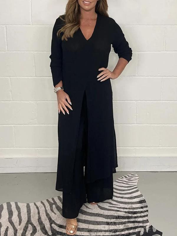 Spodnie mają szeroki krój i elastyczny pas zapewniający swobodę ruchu i wygodę. Bluzka posiada klasyczny krój, który podkreśla kobiecą sylwetkę i podkreśla talię.