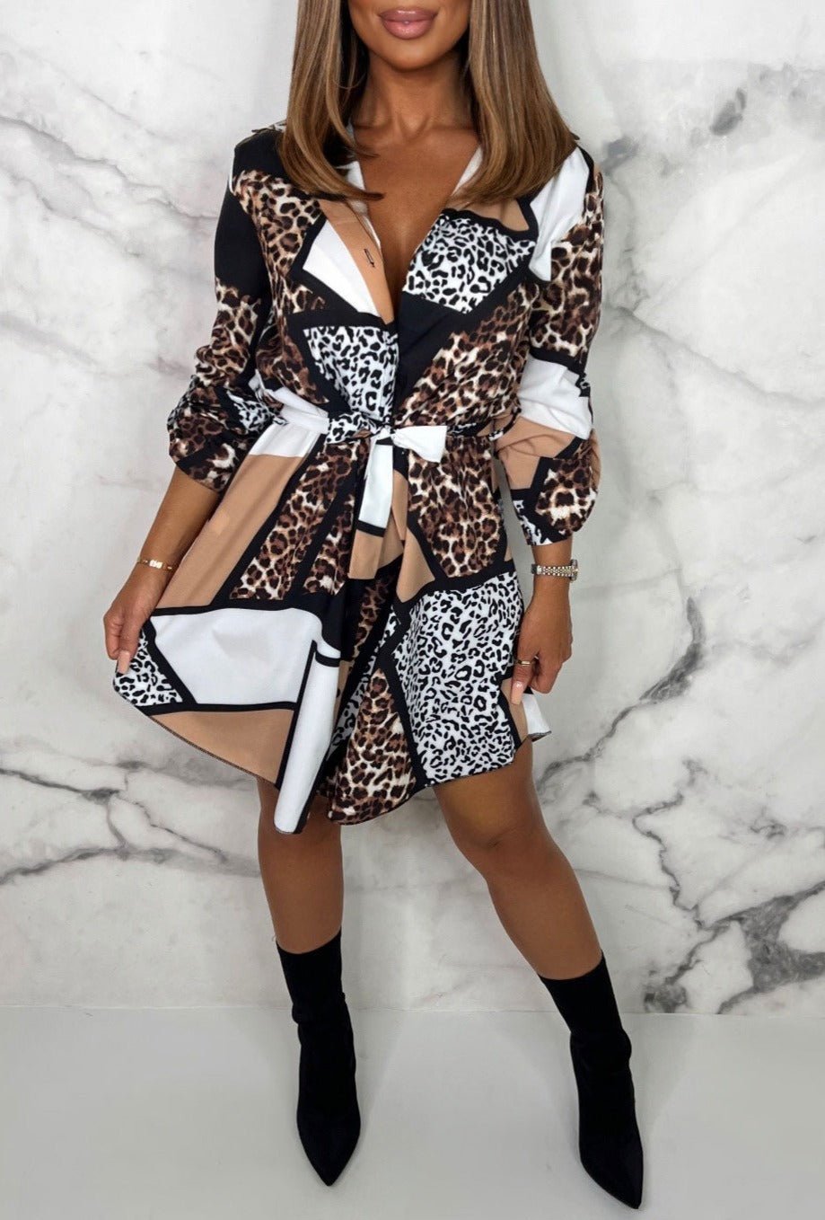 Dodaj podstawowy element swojej garderoby dzięki tej koszulowej sukience ze zwierzęcym nadrukiem .