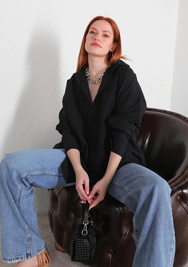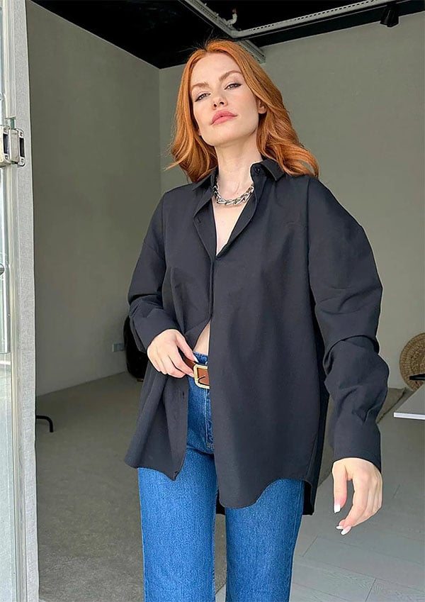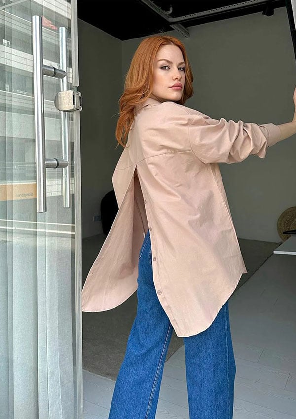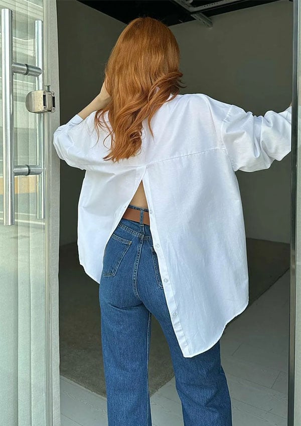 Luźna koszula z długim rękawem i rozcięciem z tyłu zapinana na guziki