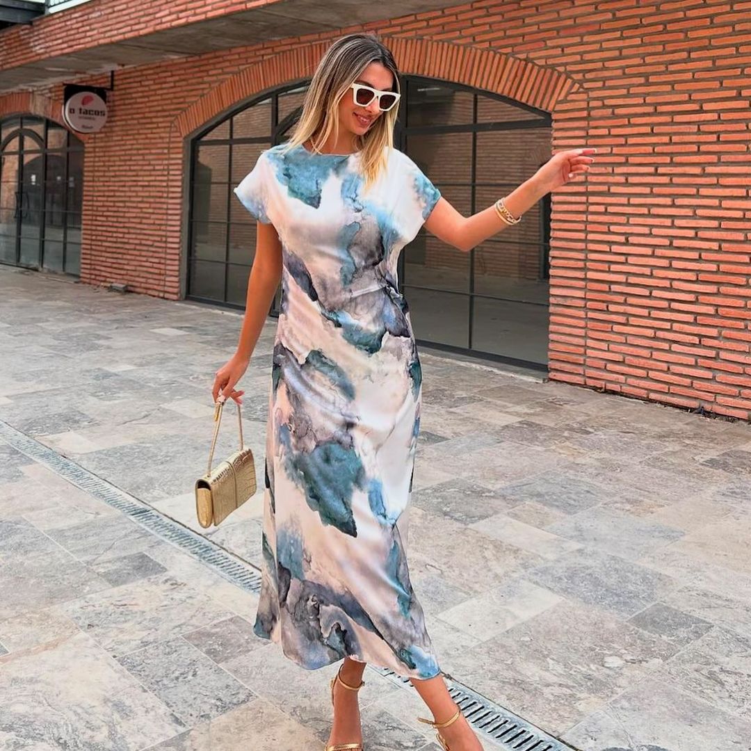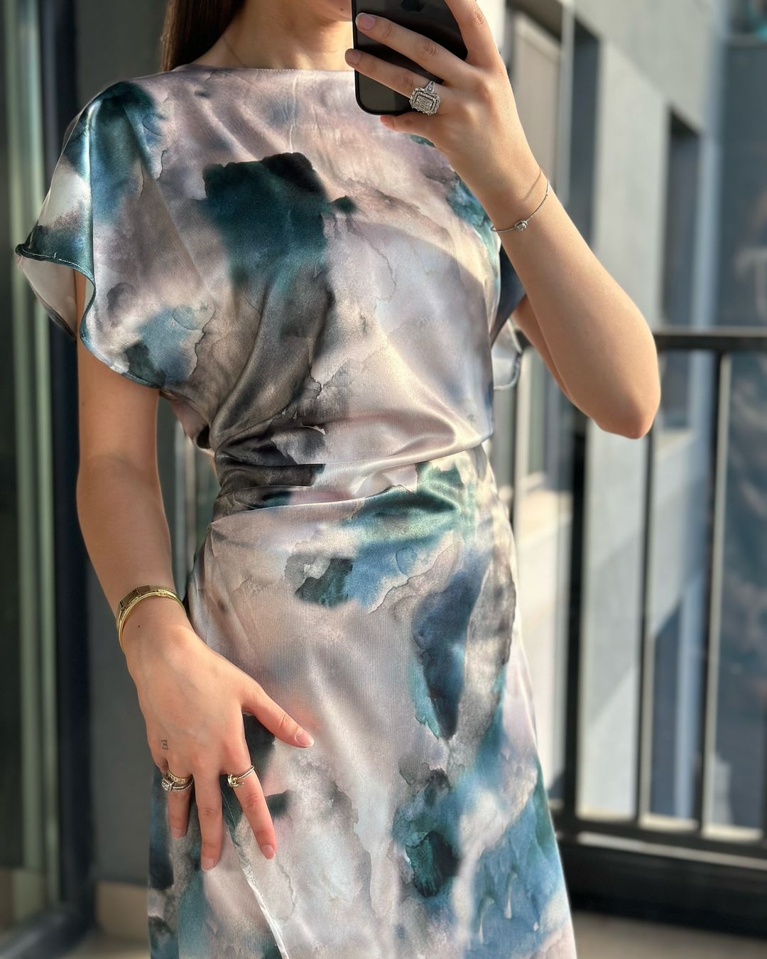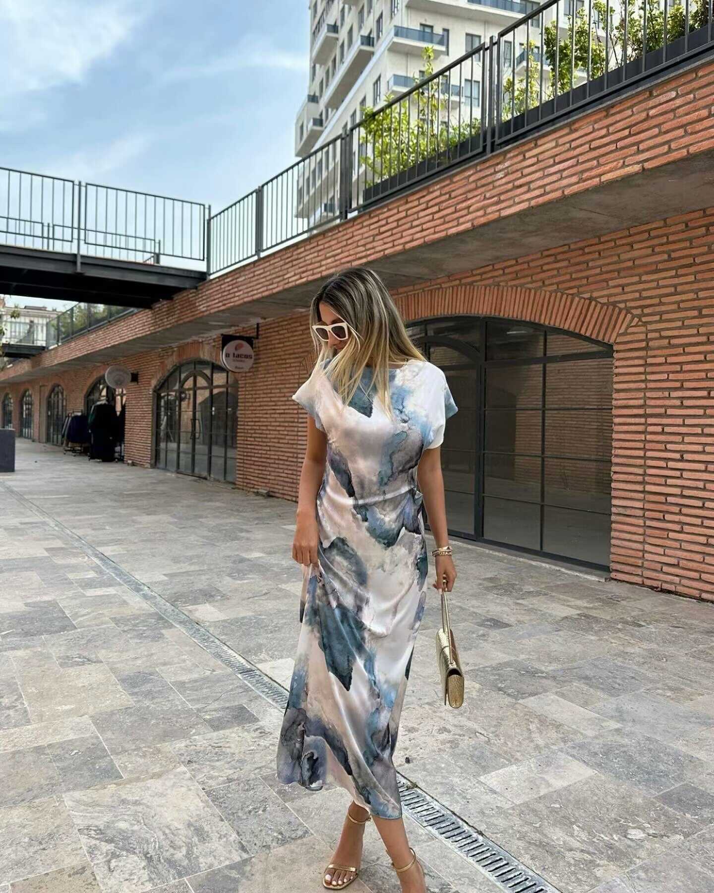 Uwolnij w sobie duszę fashionistki dzięki naszej satynowej sukience midi z nadrukiem. Ta wszechstronna sukienka ma okrągły dekolt i krótkie rękawy, idealna na każdą okazję. Luksusowa satynowa tkanina dodaje elegancji, a długość midi i kopertowy wygląd dodają jej uroku sylwetka. Wyraź siebie dzięki przyciągającemu wzrok nadrukowi. Podnieś swój styl już dziś!😍