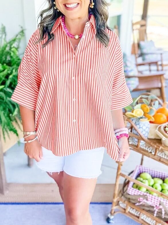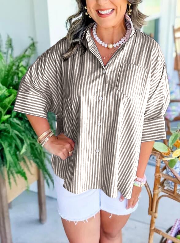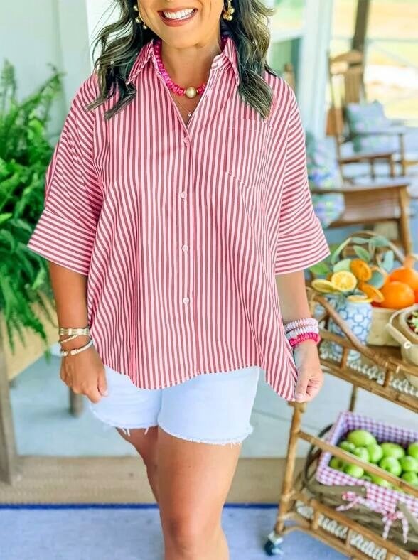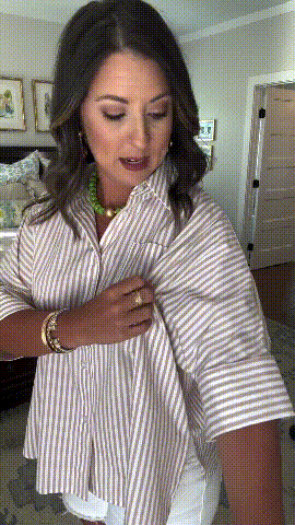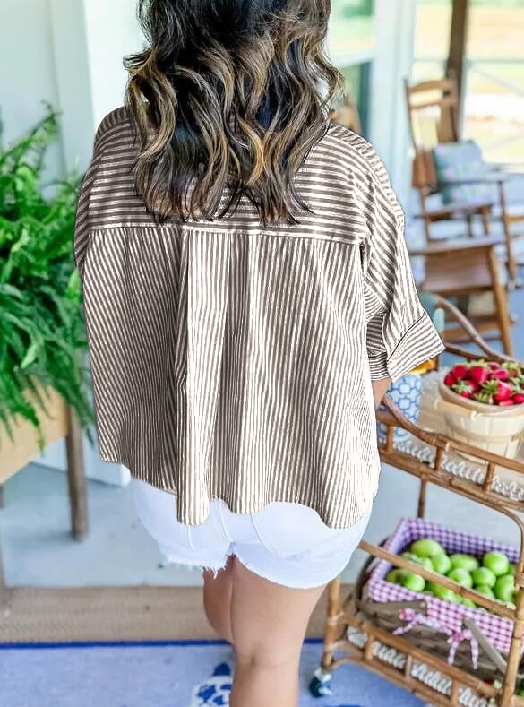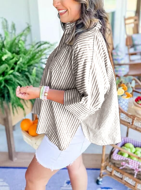 Nasza koszula w paski to idealny element Twojej garderoby tego lata! ✨ Zawiera najprzyjemniejszy w dotyku materiał. paski wzdłuż tułowia, rozcięcia po bokach i plisy z tyłu. W połączeniu z szortami i sandałami stworzy idealny letni look!