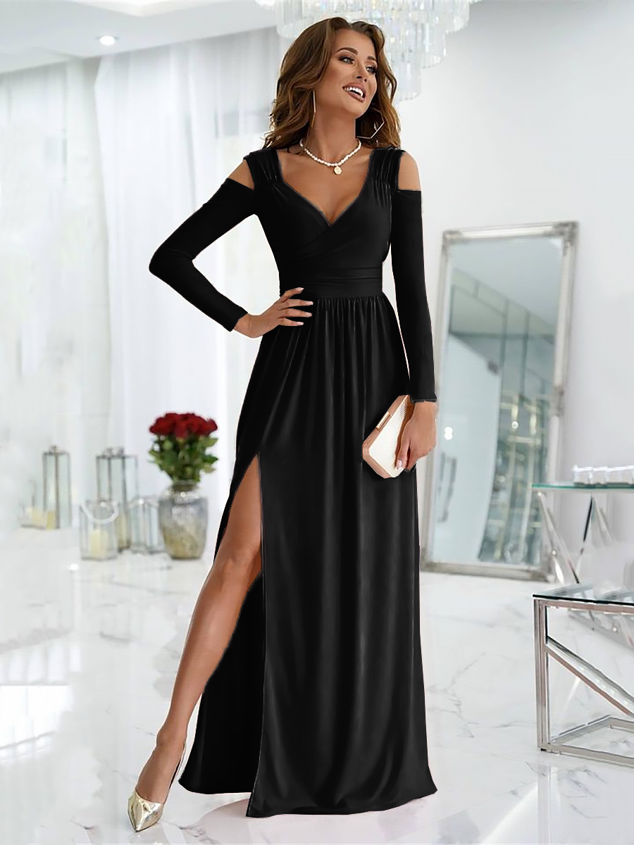 【Damska sukienka maxi】 Seksowna sukienka midi z głębokim dekoltem w kształcie litery V, długim rękawem, długością maxi, rozcięciem z boku i wysoką plisowaną talią
