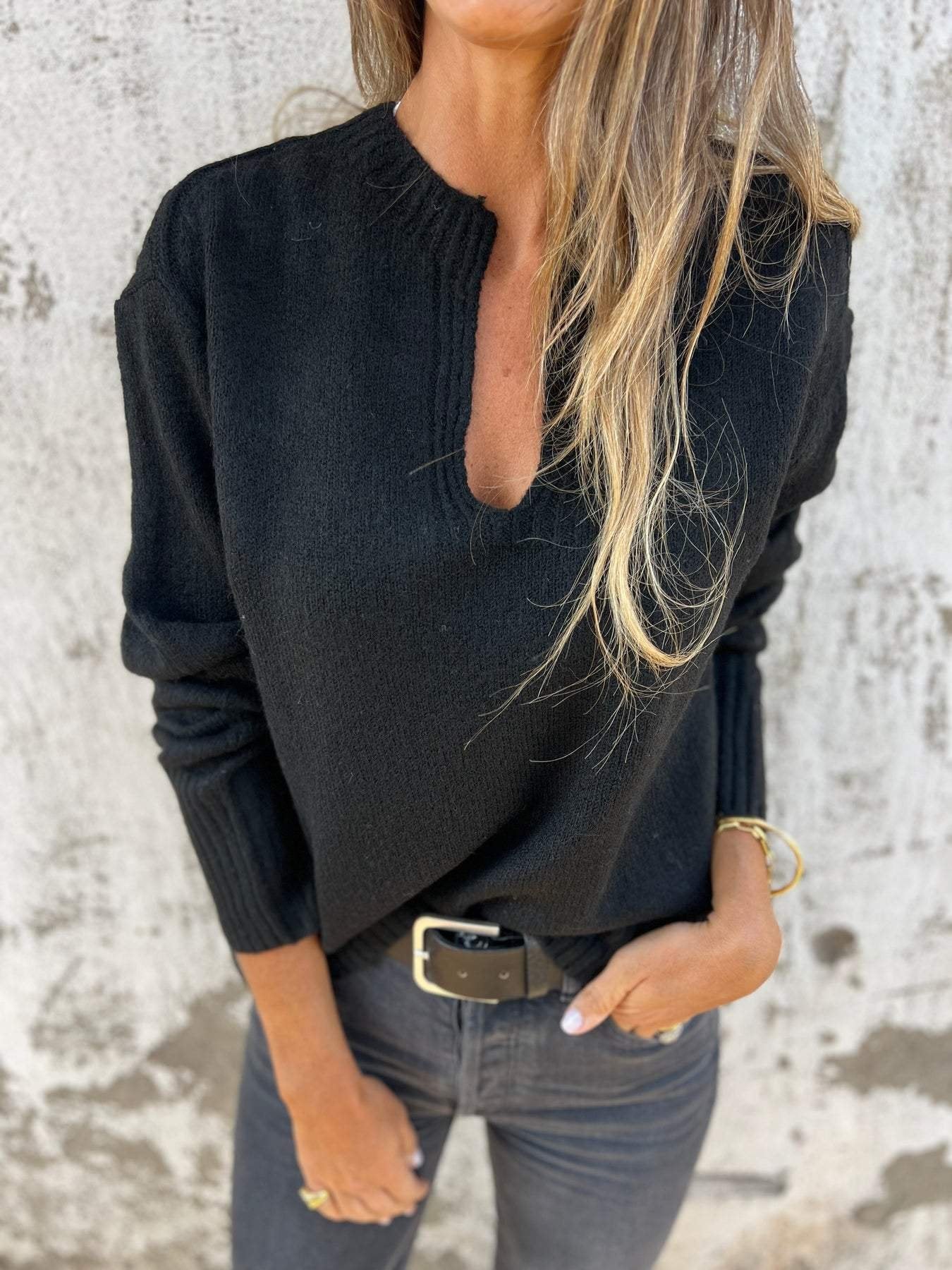 Ten dzianinowy sweter bez wysiłku łączy wygodę i wyrafinowanie, z charakterystycznym dekoltem w kształcie litery V , który podkreśla dekolt i wydłuża sylwetkę. Długie rękawy dodają ciepła i wszechstronności, dzięki czemu nadają się do układania warstw w chłodniejszych porach roku lub do noszenia samodzielnie, gdy pogoda jest łagodna.