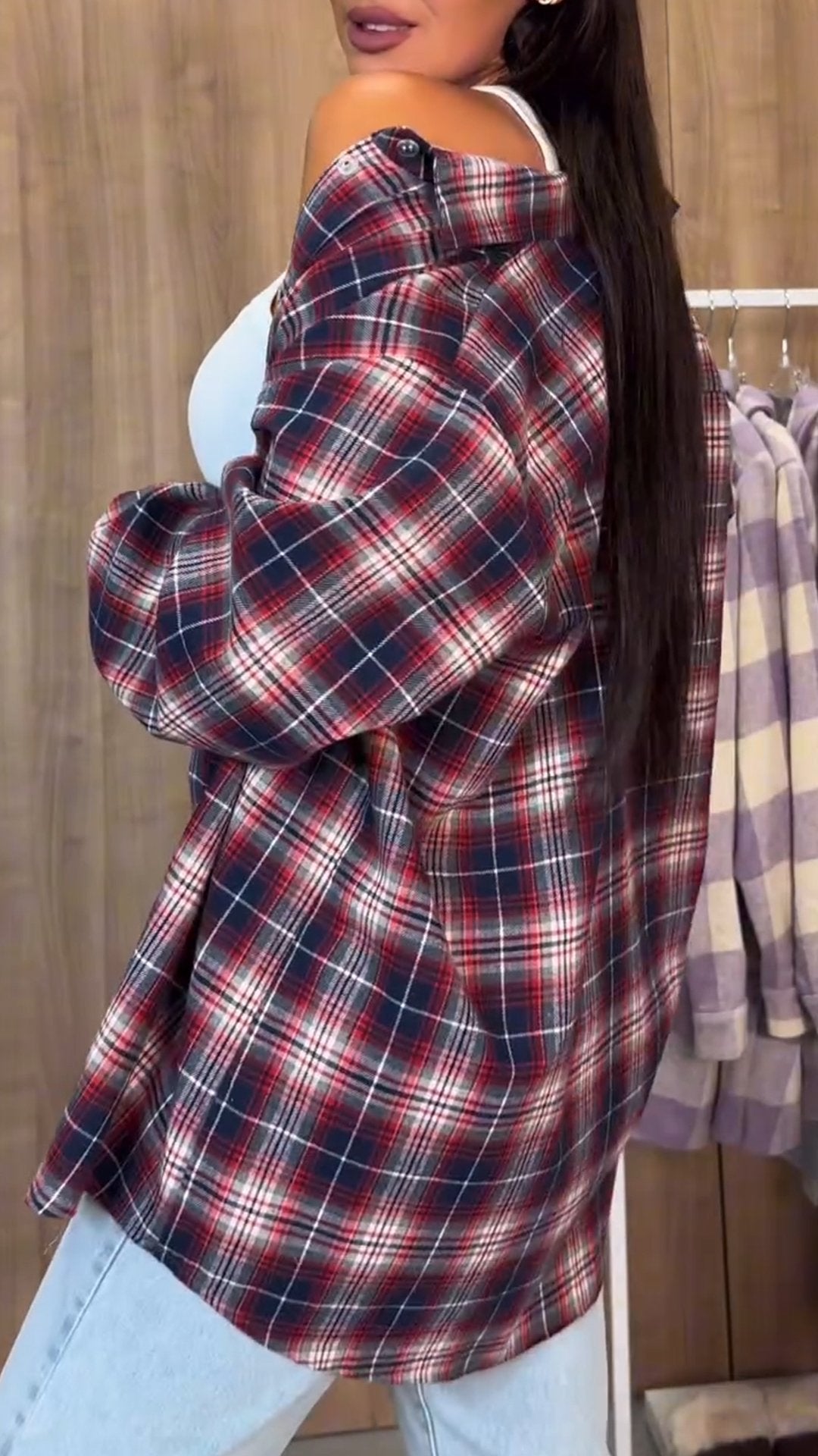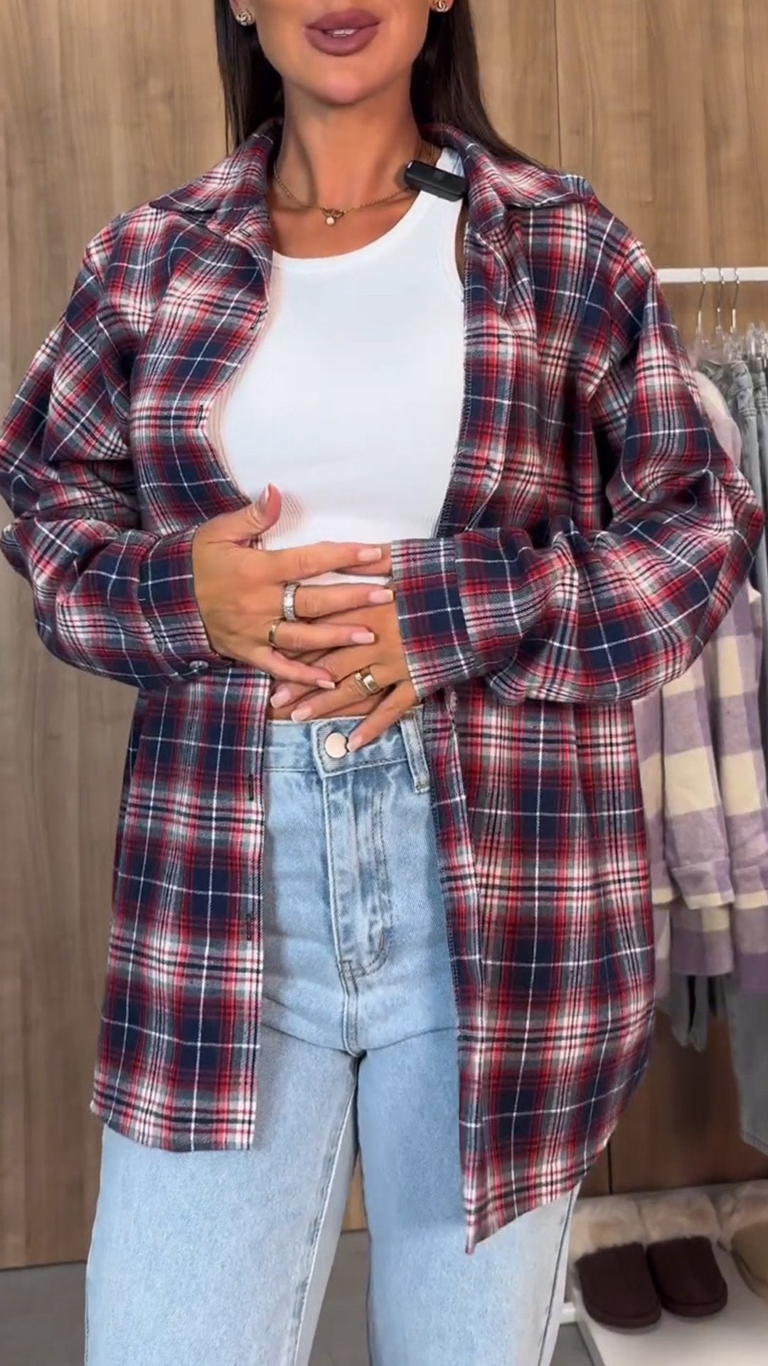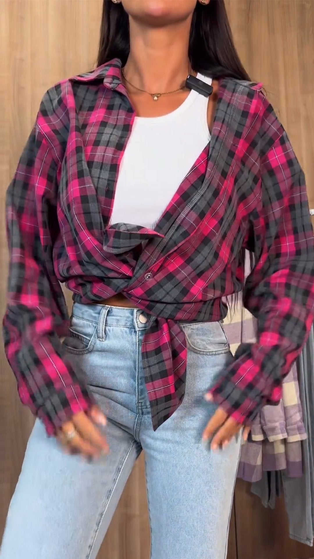 Damska koszula w kratę z długim rękawem i klapami